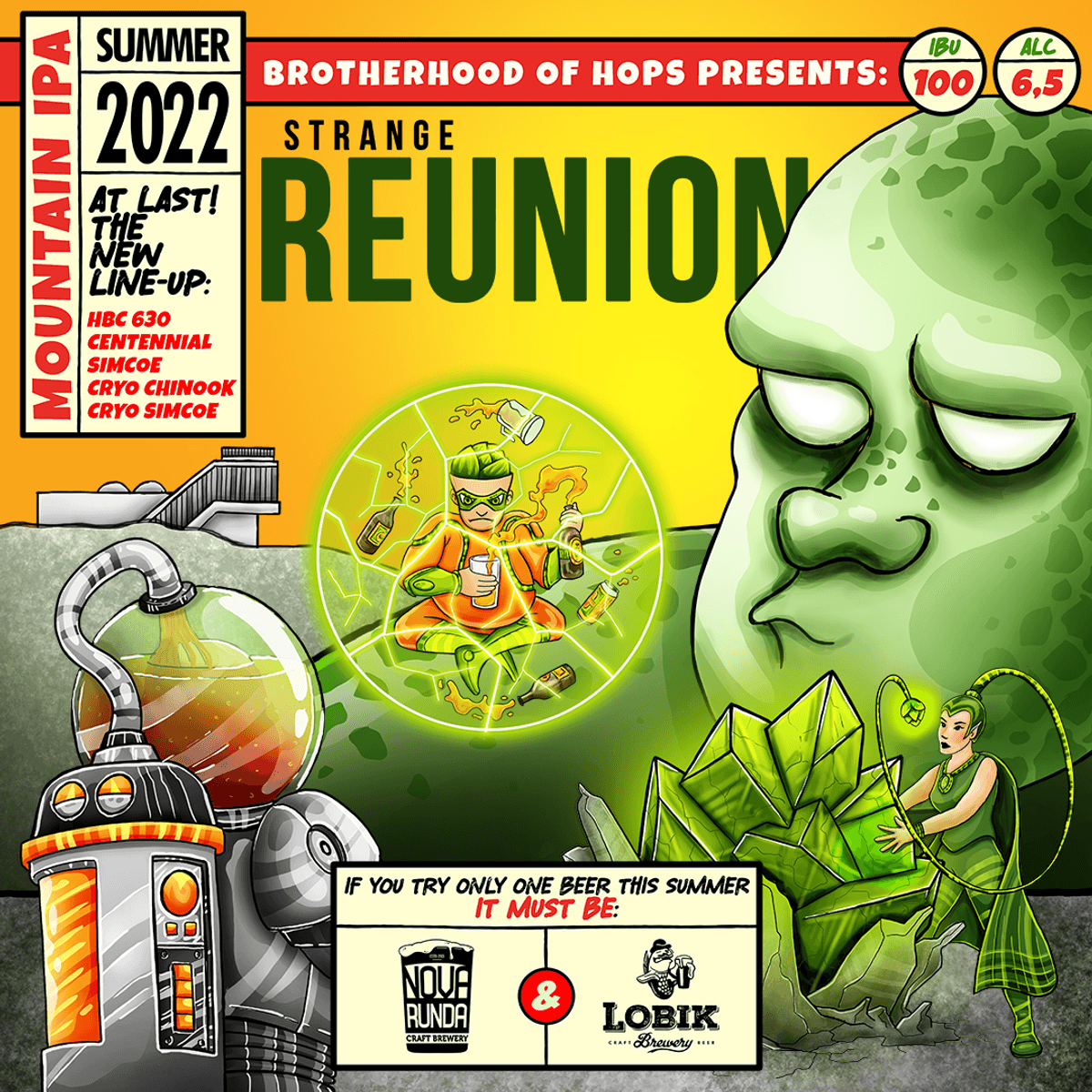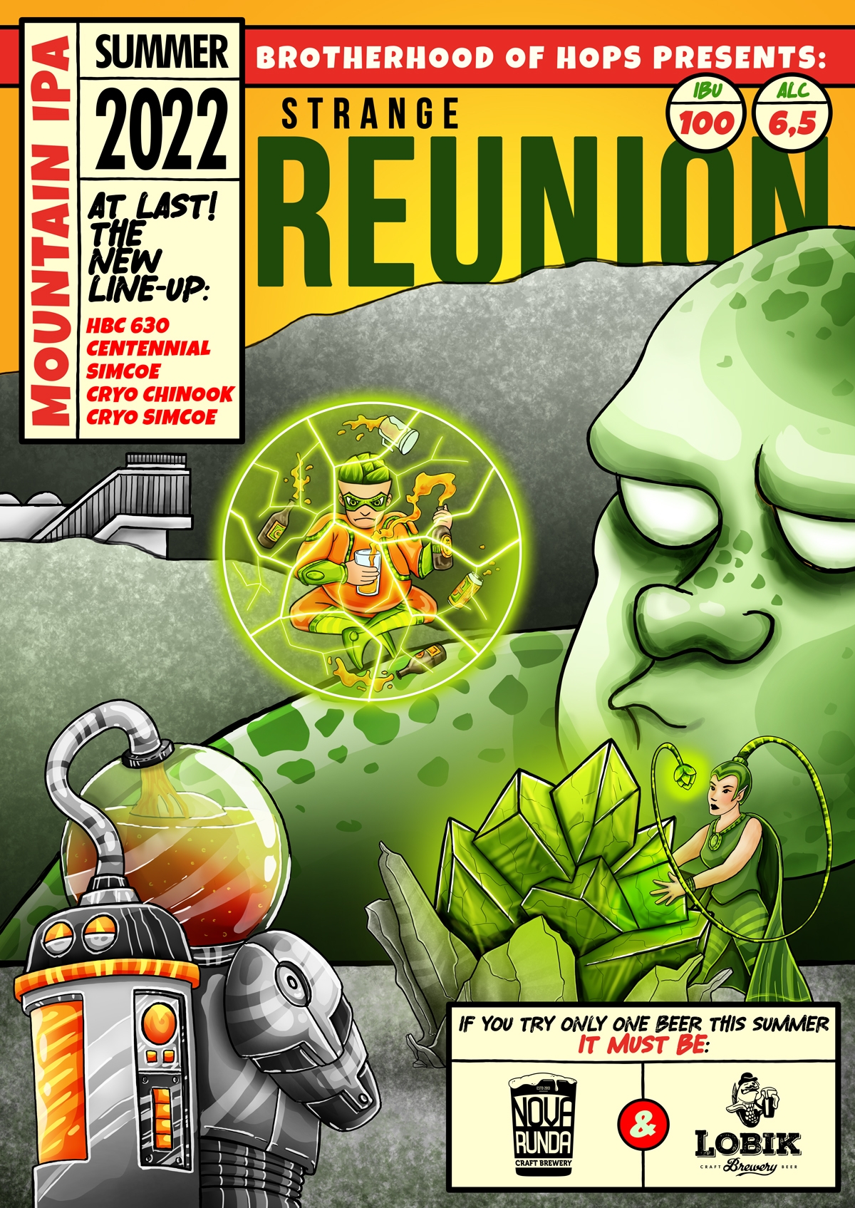 Hmeljna braća su se okupila četvrti put i to nakon perioda korone. Svima je teško pao period lockdowna i svi su jedva čekali ponovno kuhanje i hmeljenje. Kolab s drugarima iz Lobika je zaokružen Mountain IPA-om prigodnog naziva Strange Reunion.