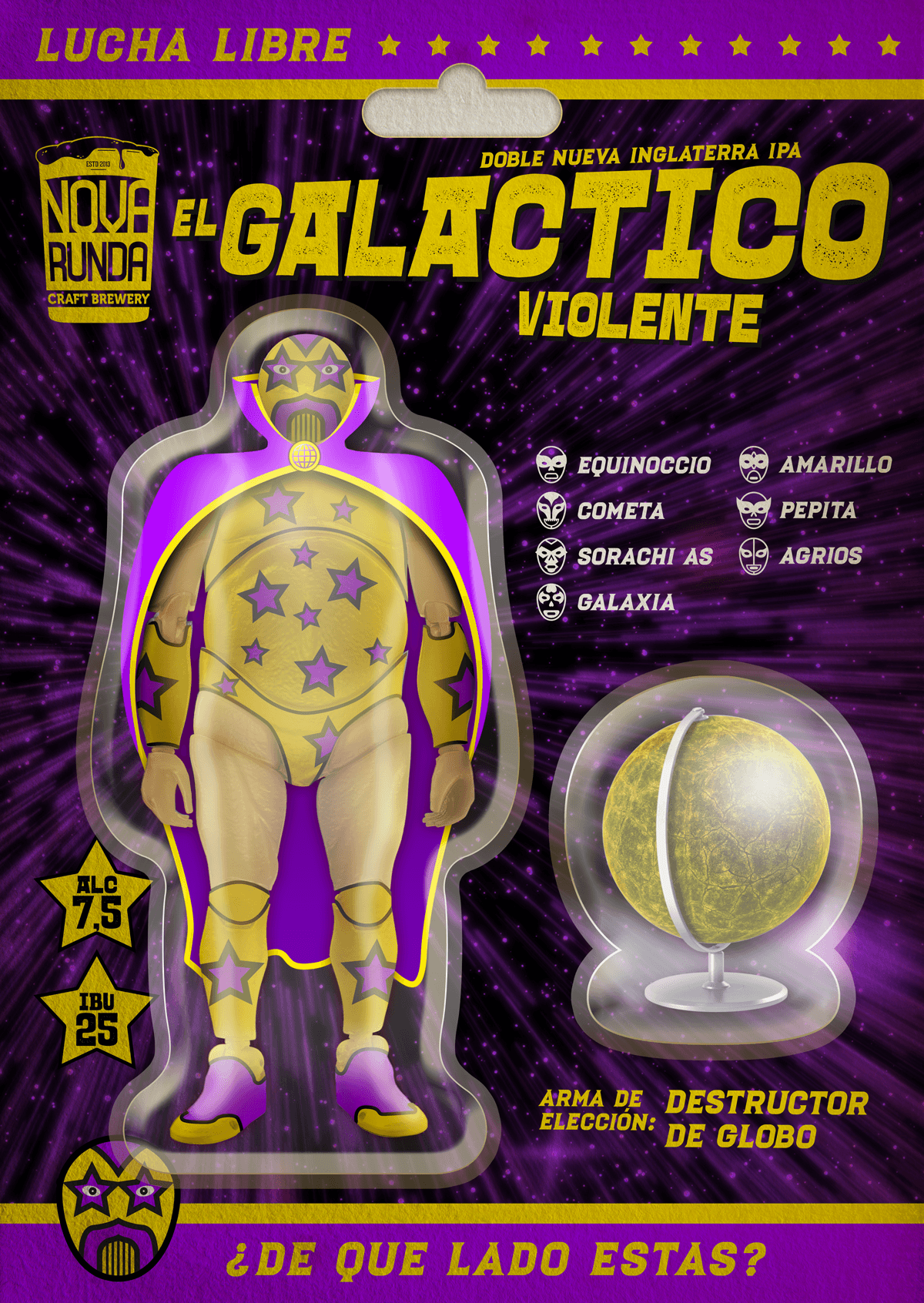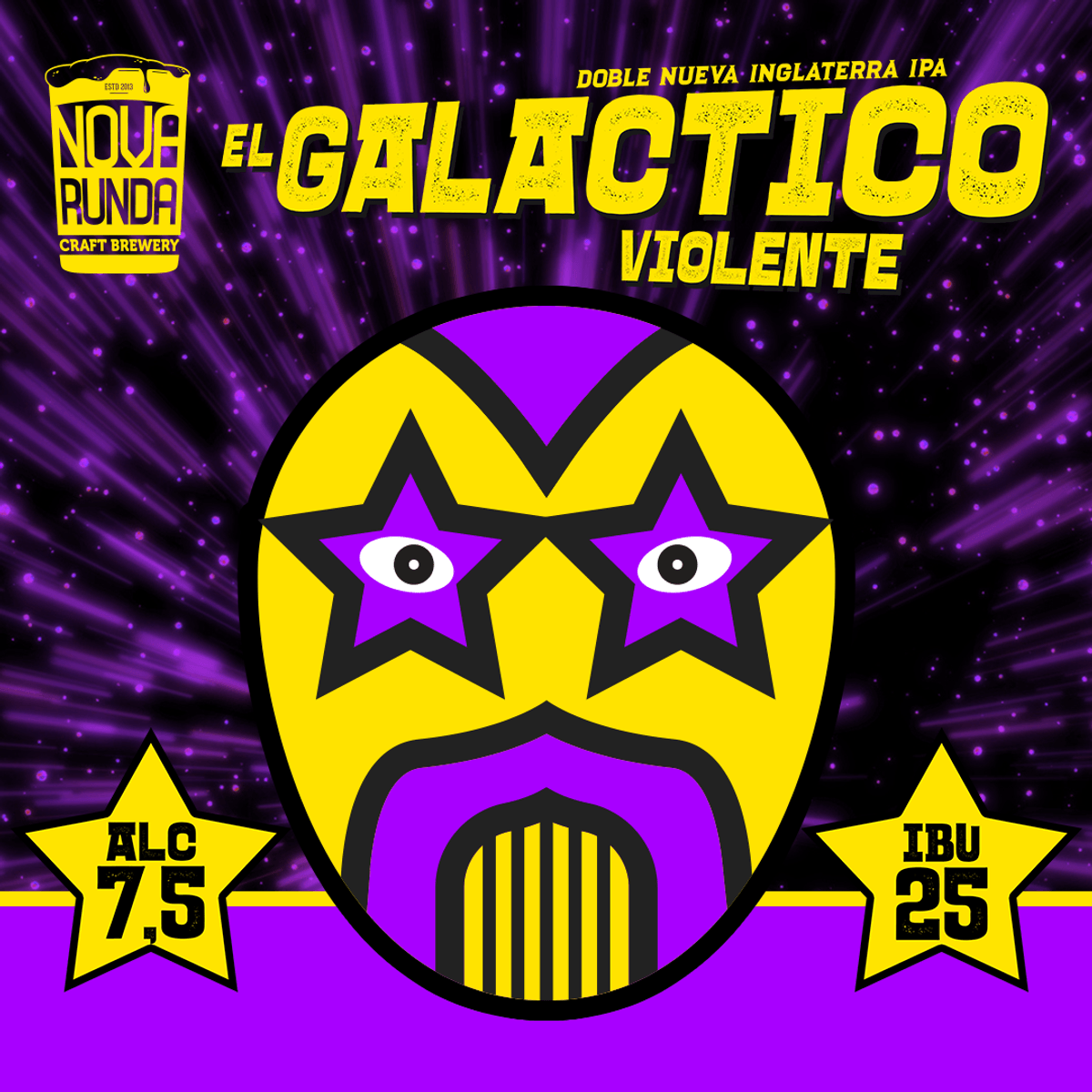 Desde las profundidades del universo, este luchador estelar con capa púrpura trae violencia galáctica a tu copa. Su globo destructor como arma promete arrasar con todo a su paso, al igual que esta IPA doble nebulosa.